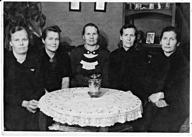 Johannes Pekko tütred, vasakult: Ilse Johanna Kuusik, Alviine Aliide Viira, Elvine Margaretha Toots, Emilie Rosalie Müllerson ja Pauline Ronk. Pilt on tehtud Õnne tn elamises, Pauline mehe Jaani matustel Tartus, ca oktoobri alguses 1946.a.. Jaan suri 30. sept 1946.