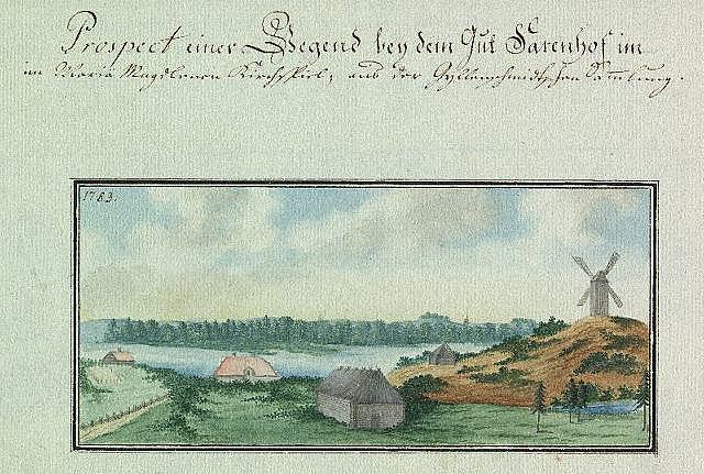 Vaade Saaremõisa (Sarenhof) maadele, Johann Christoph Brotze. Tuuleveski hilisemal kabelimäel.