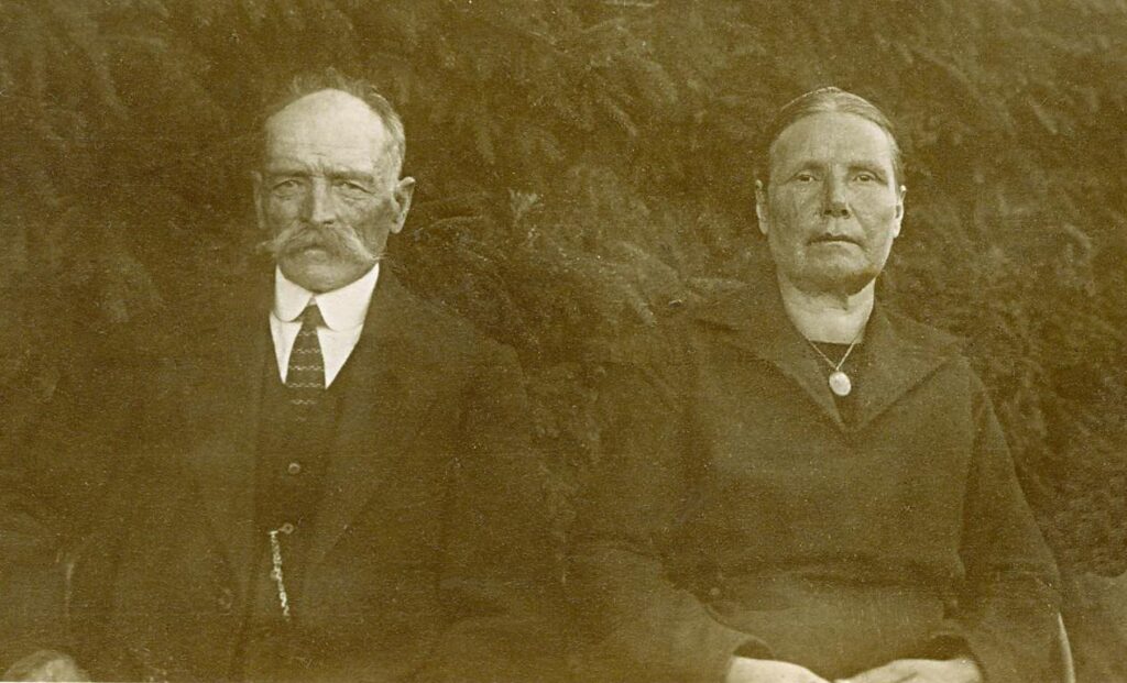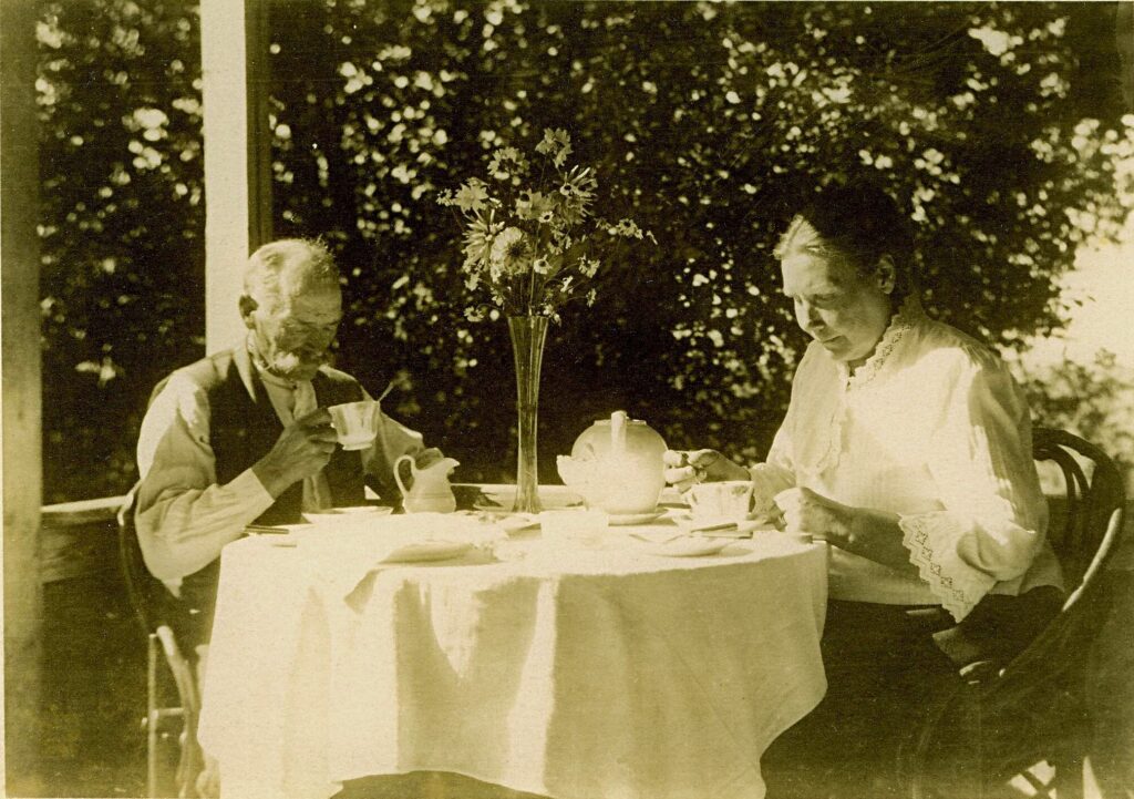 Vanavanaisa Juhan ja Emilie Veski talu uuel otsatrepil einestamas. Pilt tõenäoliselt 1920-date alguses.